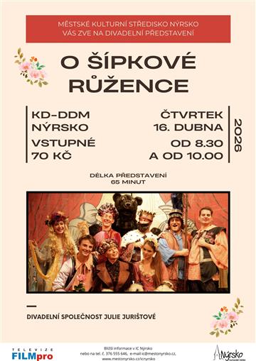 MKS Nýrsko vás zve na divadelní představení O Šípkové Růžence, které si pro vás připravila divadelní společnost Julie Jurištové. Představení se uskuteční hned dvě za sebou v kulturním domě v Nýrsku. Vstupné je 70 Kč.
