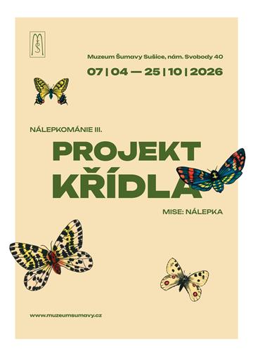 Najdeš je dřív, než uletí? Už potřetí bude letní sezóna Muzea Šumavy v Sušici zpestřena (a tentokrát doslova) hledáním nálepek. Vezmi rodinu, kamarády nebo přijď klidně SÓLO a zkus pokořit pestrobarevnou motýlí NÁLEPKOMÁNII III. Projekt: křídla Mise: nálepka Najdeš je dřív, než uletí? Už potřetí bude letní sezóna Muzea Šumavy v Sušici zpestřena (a tentokrát doslova) hledáním nálepek. Vezmi rodinu, kamarády nebo přijď klidně SÓLO a zkus pokořit pestrobarevnou motýlí NÁLEPKOMÁNII III., 7. 4. – 25. 10. 2026. (Zapsal: Muzeum Šumavy, 16.03.26) | |