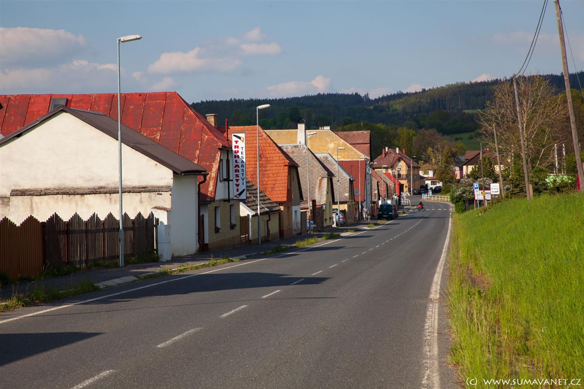 Domky jsou rozmístěny podél silnice na Kašperské Hory.