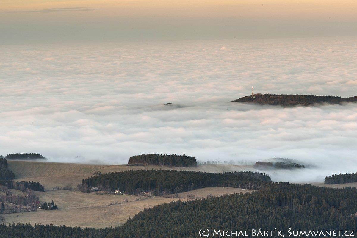 Dřevěná rozhledna vysoká 21 metrů umístěná na vrcholu Boubína.