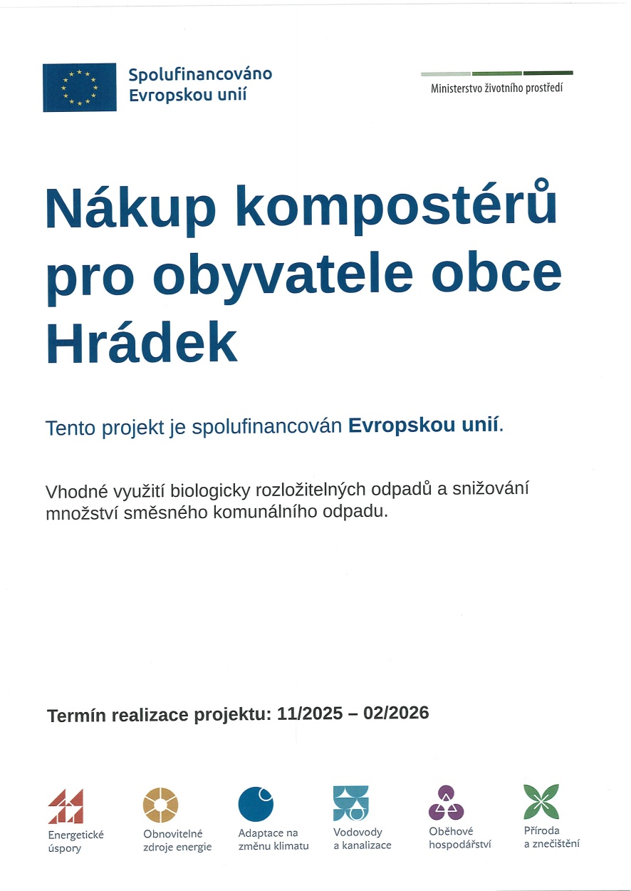 Obsah stránkyNákup kompostérů pro obyvatele obce Hrádek (2025)NÁKUP KOMPOSTÉRŮ PRO OBYVATELE OBCE HRÁDEK CELKOVÉ NÁKLADY: 1 028 500 KčVÝŠE DOTACE: DODAVATEL: Zahrada-Dílna-Stroje s.r.o Návrat na předchozí stránku