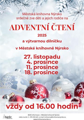 Městská knihovna Nýrsko srdečně zve všechny děti a jejich rodiče na 4. Adventní čtení s výtvarnou dílničkou.