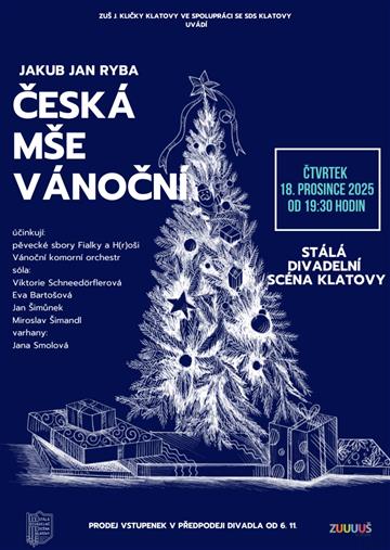 Základní umělecká škola Josefa Kličky Klatovy ve spolupráci se Stálou divadelní scénou Klatovy zve na vánoční koncert, na kterém zazní tradiční vánoční skladba přeštického rodáka J. J. Ryby, a to za doprovodu velkého orchestru, divadelních varhan a za přítomnosti tradičních pěveckých sólistů. Účinkují: Jana Smolová (varhany), Fialky, H®oši a Vánoční komorní orchestr Sóla: Viktorie Schneedörflerová, Eva Bartošová, Jan Šimůnek a Miroslav Šimandl Diriguje: Jaroslav Pleticha (Zapsal: Stálá divadelní scéna Klatovy, 06.11.25) | |