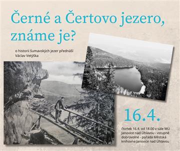 Přednáška o šumavských jezerech, zejména o Černém a Čertovo... Historické fotografie promítne a zajímavosti o jezerech prozradí Václav Vetýška. Vstupné je dobrovolné.