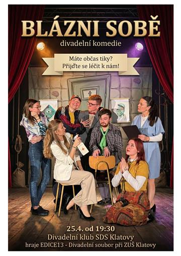 Máte někdy pocit, že jste divní? Počkejte, až uvidíte tohle! Do ordinace světově uznávaného specialisty na OCD (obsedantně-kompulzivní poruchy) se sjíždí pestrá skupinka pacientů. Jenže doktor nikde... Hra "Blázni sobě" je adaptace hry Tik Tik z prostředí čekárny psychiatrické ordinace. Hraje: EDICE13 - divadelní soubor při ZUŠ Klatovy Režie: Vladimír Kabrt Hrají: Jan Bytel, Adéla Hyťhová, Jan Malát, Eliška Hošková, Jakub Mazán, Michaela Kortánová, Natálie Bláhová. Alt. Lucie Lindauerová (Zapsal: Stálá divadelní scéna Klatovy, 21.01.26) | |
