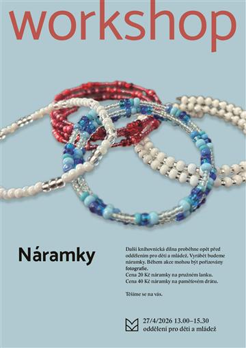 Přijďte na další knihovnickou dílnu, kde si vyrobíme náramky z korálků. Cena 20 Kč náramky na pružném lanku, 40 Kč náramky na paměťovém drátku.