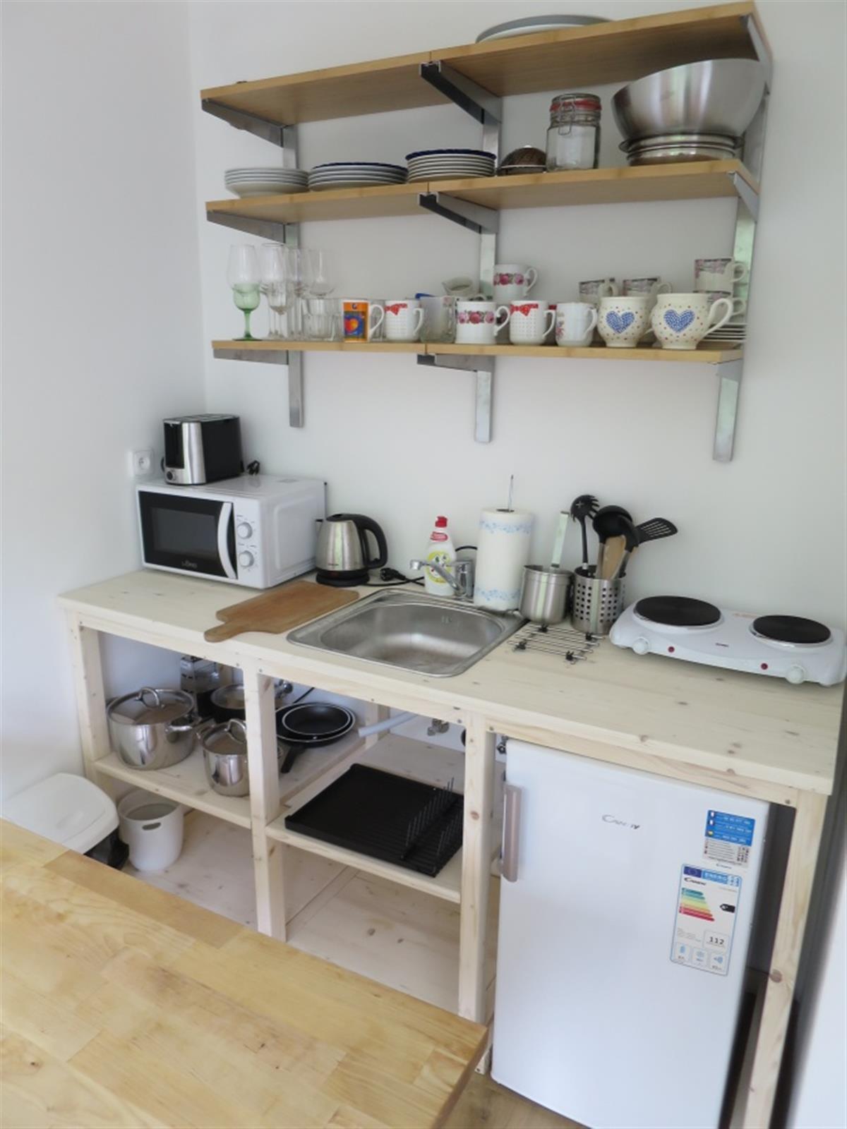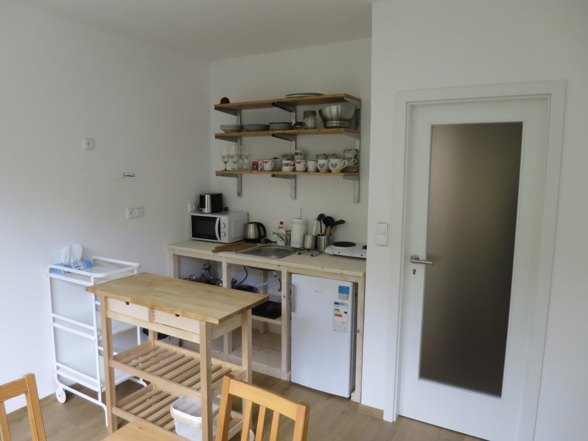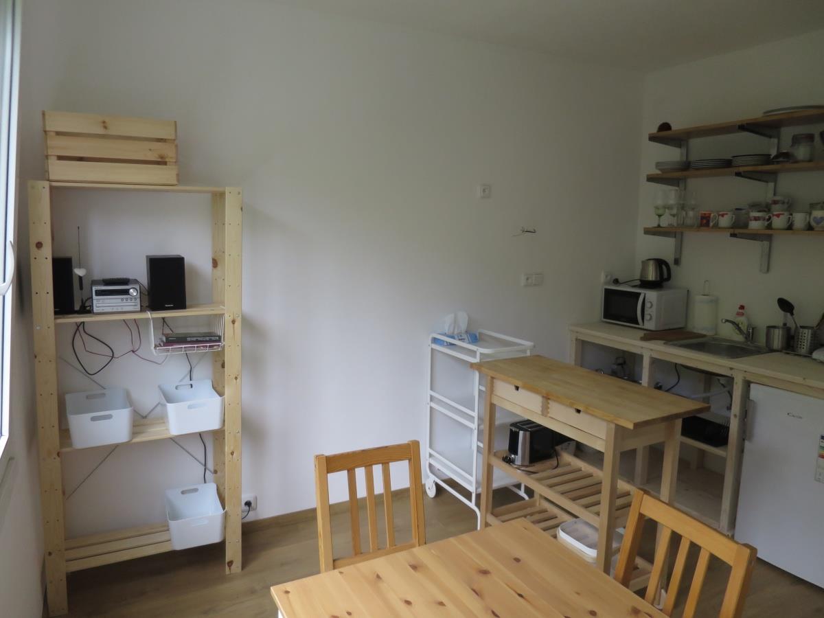 Kompletně vybavený a zařízený apartmán vč. kuch. linky se spotřebiči (dvou-vařič, MV trouba, RV konvice, toustovač, lednice s mrazákem) a nádobím, dále koupelna se sprchou, umyvadlem a topným žebříkem (lze zapnout i v létě), oddělenou toaletou, předsíní s úložným prostorem a ložnicí se čtyřmi lůžky rozdělenou na dvě části – pouze spací (manželská postel) a obývací a spací (rozkládací sedací souprava, komoda, O2 TV, stolek, zrcadlo).