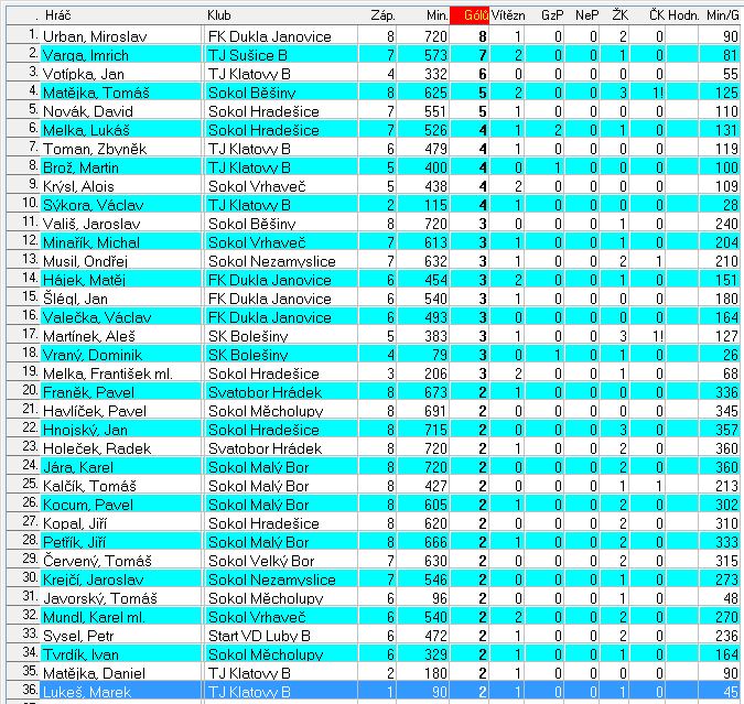 STATISTIKA HRÁČŮ - OKRESNÍ PŘEBOR PODLE VSTŘELENÝCH BRANEK PO 8. KOLE