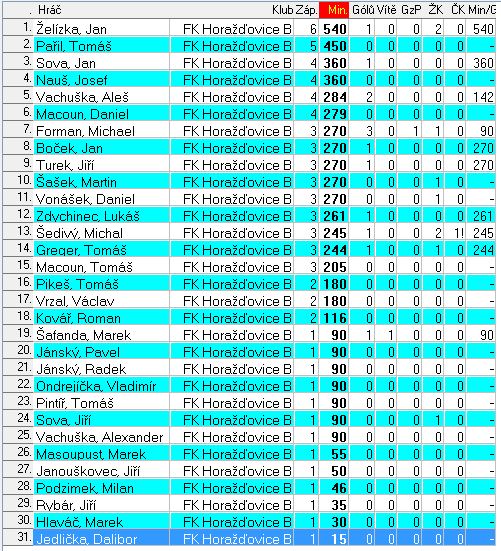 Sestava FK Horažďovice: Sova Jan, Šedivý Michal (2xŽK/ČK), Pařil Tomáš, Turek Jiří, Jánský Radek, Vonášek Daniel, Želíska Jan, Masopust Marek (55. Rybár Jiří), Macoun Tomáš (75. Jedlička Dalibor), Pikeš Tomáš, Šašek Martin