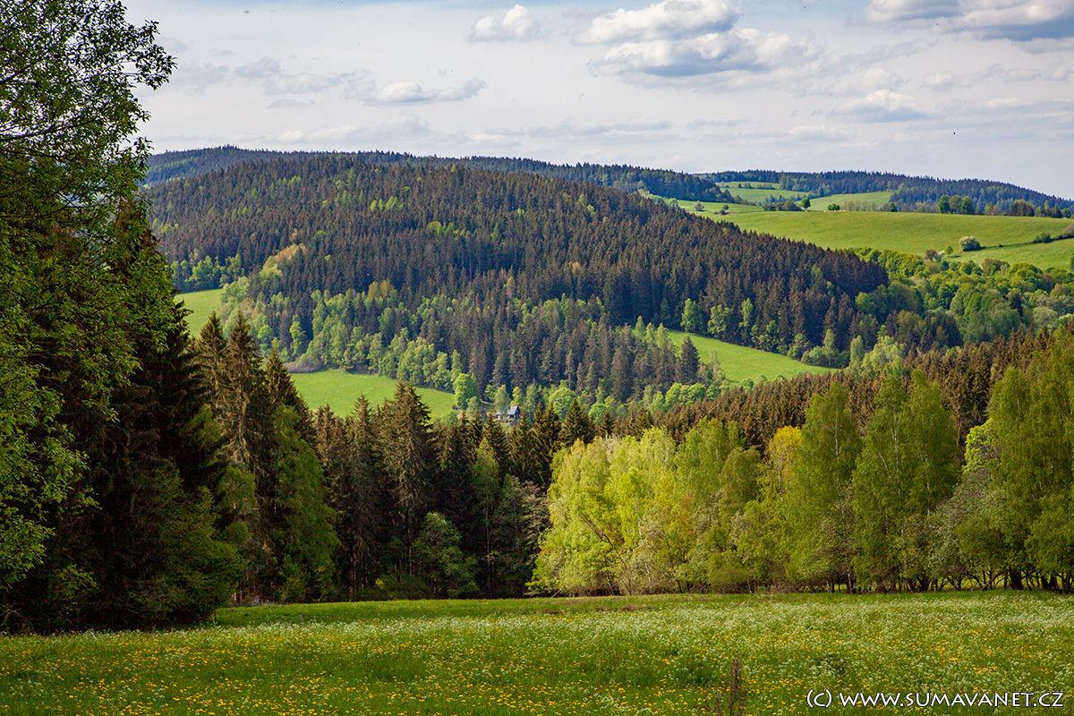 Wir fahren weiter auf der gelben Straße nach Pekelské údolí und kehren auf der asphaltierten (aber wenig befahrenen) Straße nach Hartmanice zurück und genießen unterwegs die Aussicht.