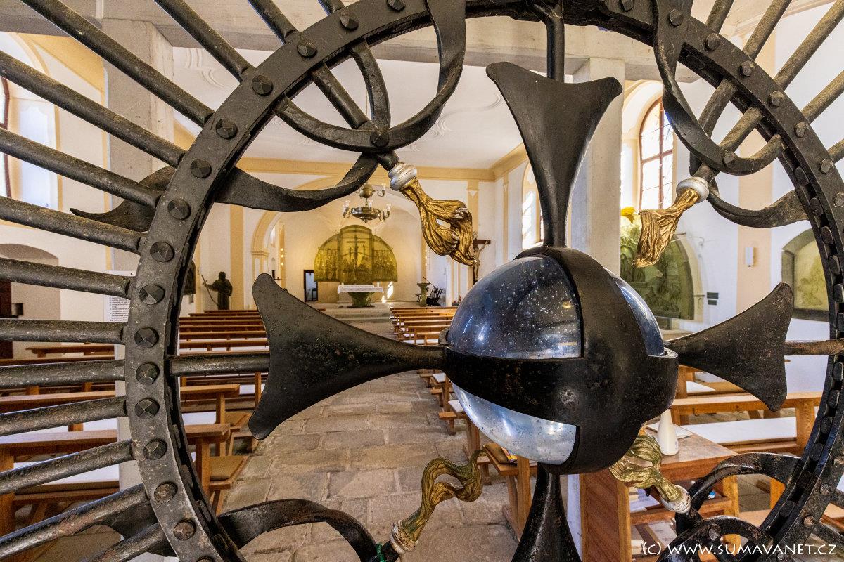 Vom Platz aus folgen wir dem blauen Touristenschild zur Kirche St. Kateřiny und wir erklimmen den Hang des Hamižná-Hügels oberhalb der Stadt zur alten Soumar-Kapelle. Von diesen Orten aus hat man einen schönen Blick auf Hartmanicko und Sušicko.