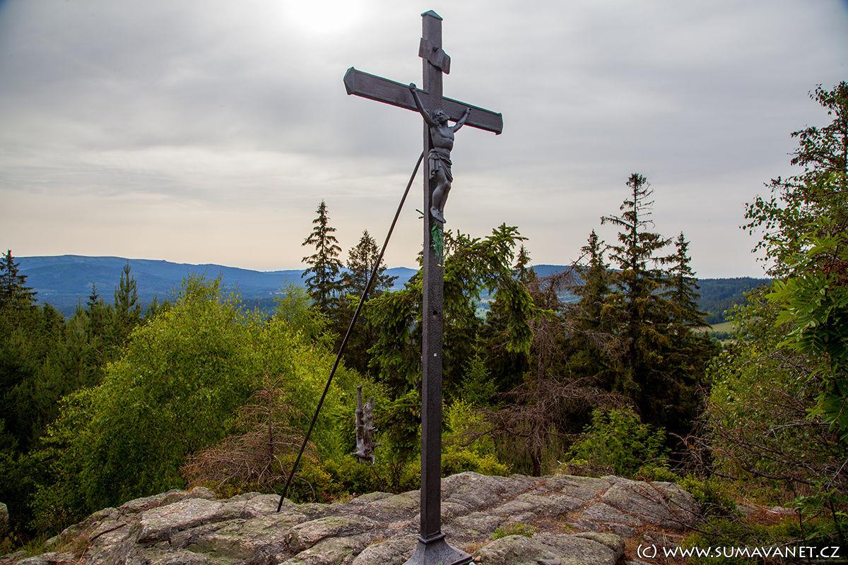 Wir steigen vorsichtig die Steinstufen zum Gipfel des Březnická skály und zum Kreuz auf dem Gipfel des Březník (1006 m ü. M.) hinauf. Obwohl der Aussichtspunkt auf der Karte markiert ist, verdecken die Bäume nach und nach die Aussicht.