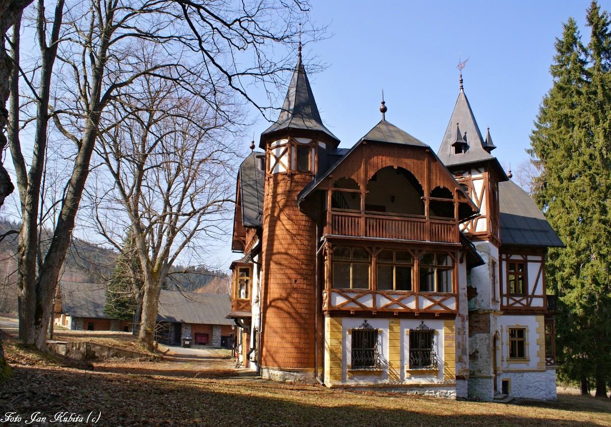 Während der ersten Republik entstand in Pustina die tschechoslowakische Politik, und Präsident Edvard Beneš war hier ein häufiger Gast. Das Gebäude wurde 1964 vom legendären Böhmerwalder Arzt MUDr. vor der Liquidation gerettet. Kostrouch, bekannt als der Arzt zu Pferd, der dank seiner Kontakte das Gebäude erhielt. Und von dort aus bereiste er seine Patienten zu Pferd durch ein weites Gebiet. Wir empfehlen auf keinen Fall, ein stark heruntergekommenes und zerfallendes Gebäude zu betreten. Einerseits besteht ein hohes Verletzungsrisiko, andererseits betreten wir ein Grundstück eines Privatbesitzers.