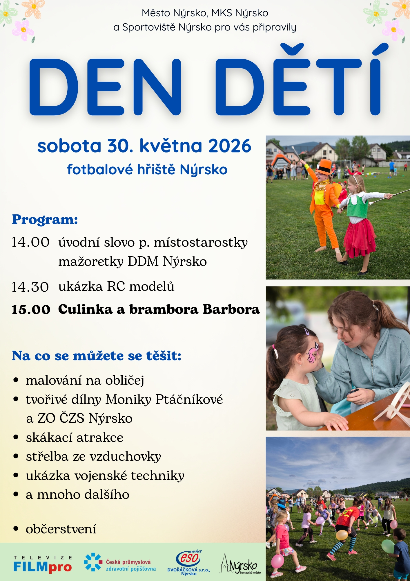 Město Nýrsko, MKS a Sportoviště Nýrsko připravily pro děti zábavné odpoledne. Těšit se můžete na Culinku a bramboru Barboru, Marshalla a Skye, tvořivé dílny, mažoretky DDM Nýrsko, nafukovací překážkovou dráhu, ukázku vojenské techniky a další stanoviště s nejrůznějšími hrami. Vstupné zdarma.