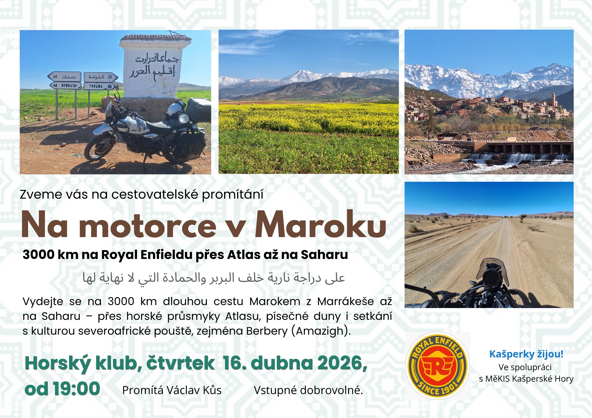Dobrodruh a oceněný Kastelán roku hradu Kašperk Václav Kůs zve na cestovatelské promítání z cesty po Maroku – 3000 km na Royal Enfieldu z Marrákeše přes Atlas až na Saharu.