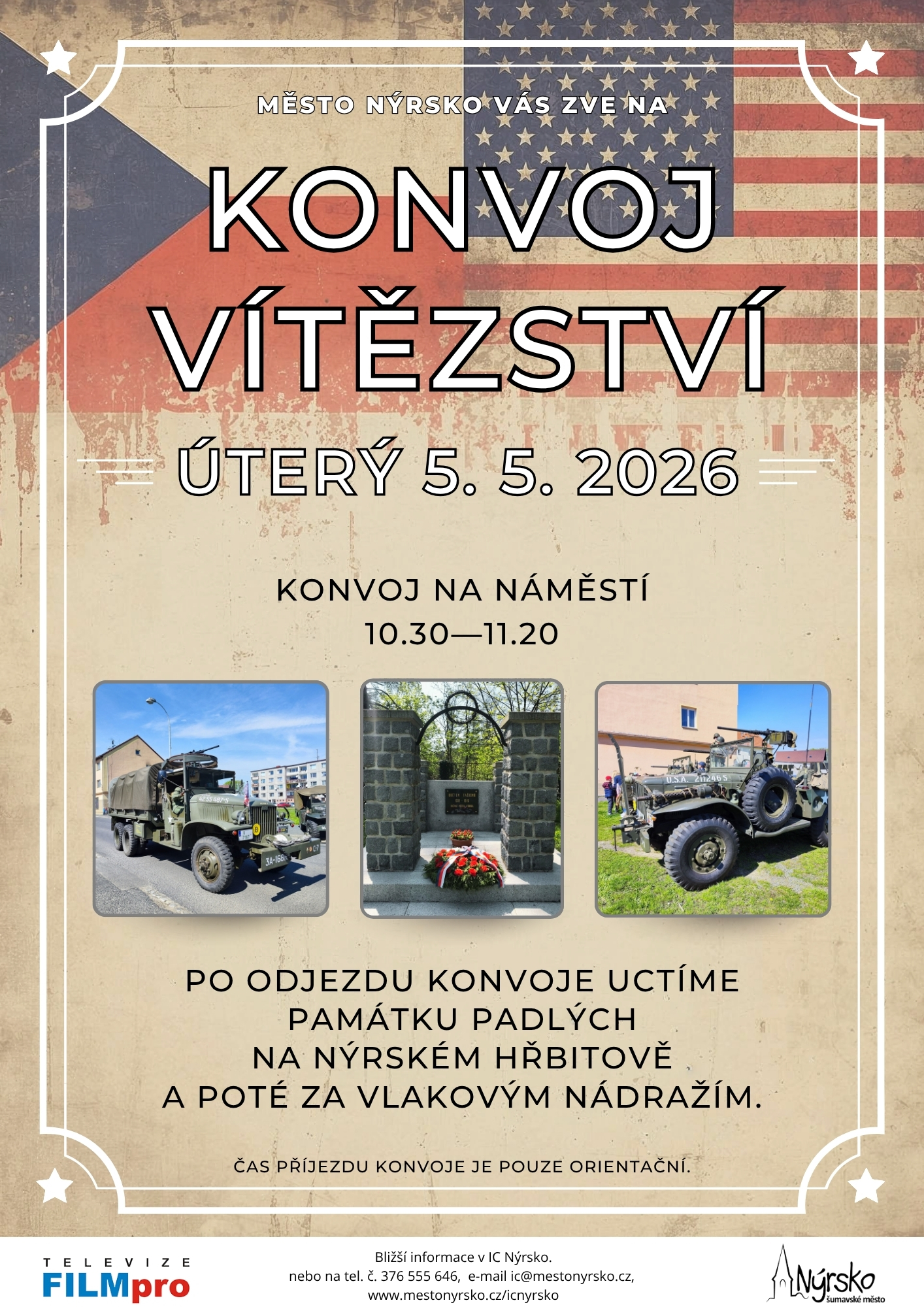 Město Nýrsko vás zve na Konvoj vítězství, který bude na našem náměstí cca od 10.30–11.20 hodin, po odjezdu konvoje uctíme památku padlých na nýrském hřbitově a poté za vlakovým nádražím. Čas příjezdu konvoje je pouze orientační. (Zapsal: INFORMAČNÍ CENTRUM NÝRSKO, 17.04.26) | ||