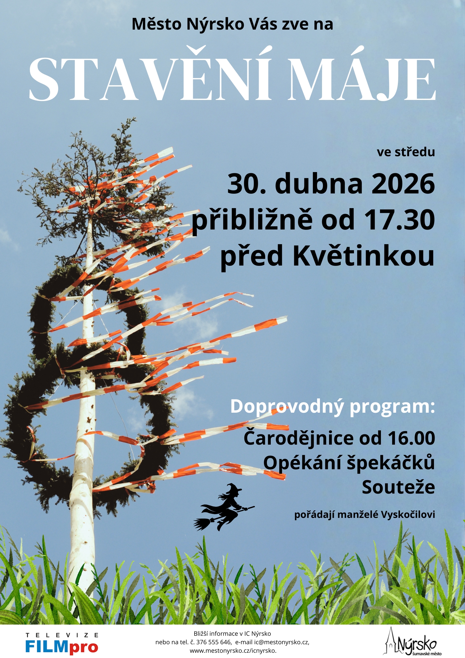 Srdečně vás zveme na tradiční stavění májky, které se uskuteční ve středu 30. dubna 2026 před květinkou u náměstí v Nýrsku. Jako každý rok si připravili manželé Vyskočilovi od 16.00 hodin doprovodný program. Těšit se můžete na čarodějnice, opékání buřtů a soutěže pro děti. Stavění máje proběhne přibližně od 17.30 (přesný čas se může mírně lišit). (Zapsal: INFORMAČNÍ CENTRUM NÝRSKO, 17.04.26) | ||