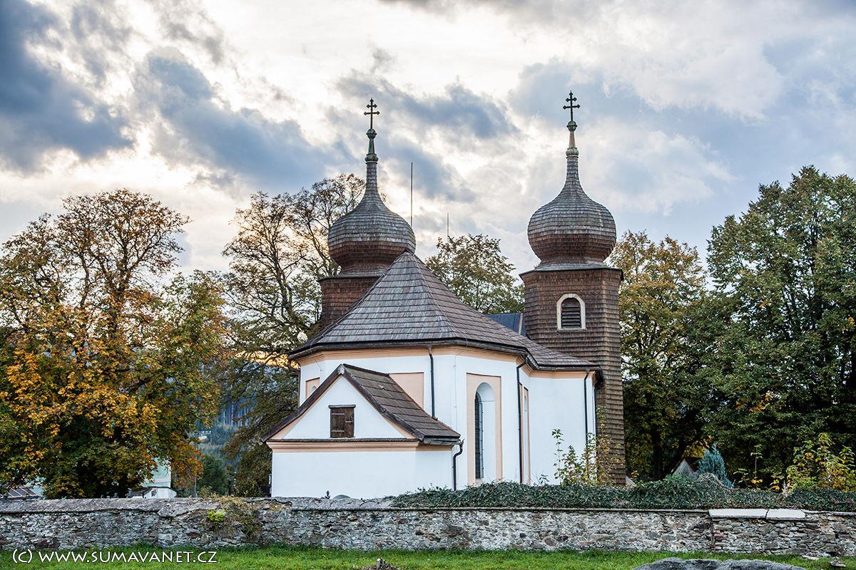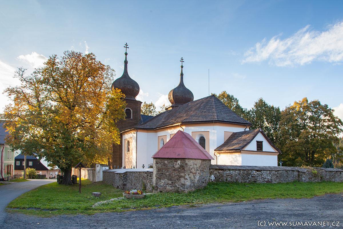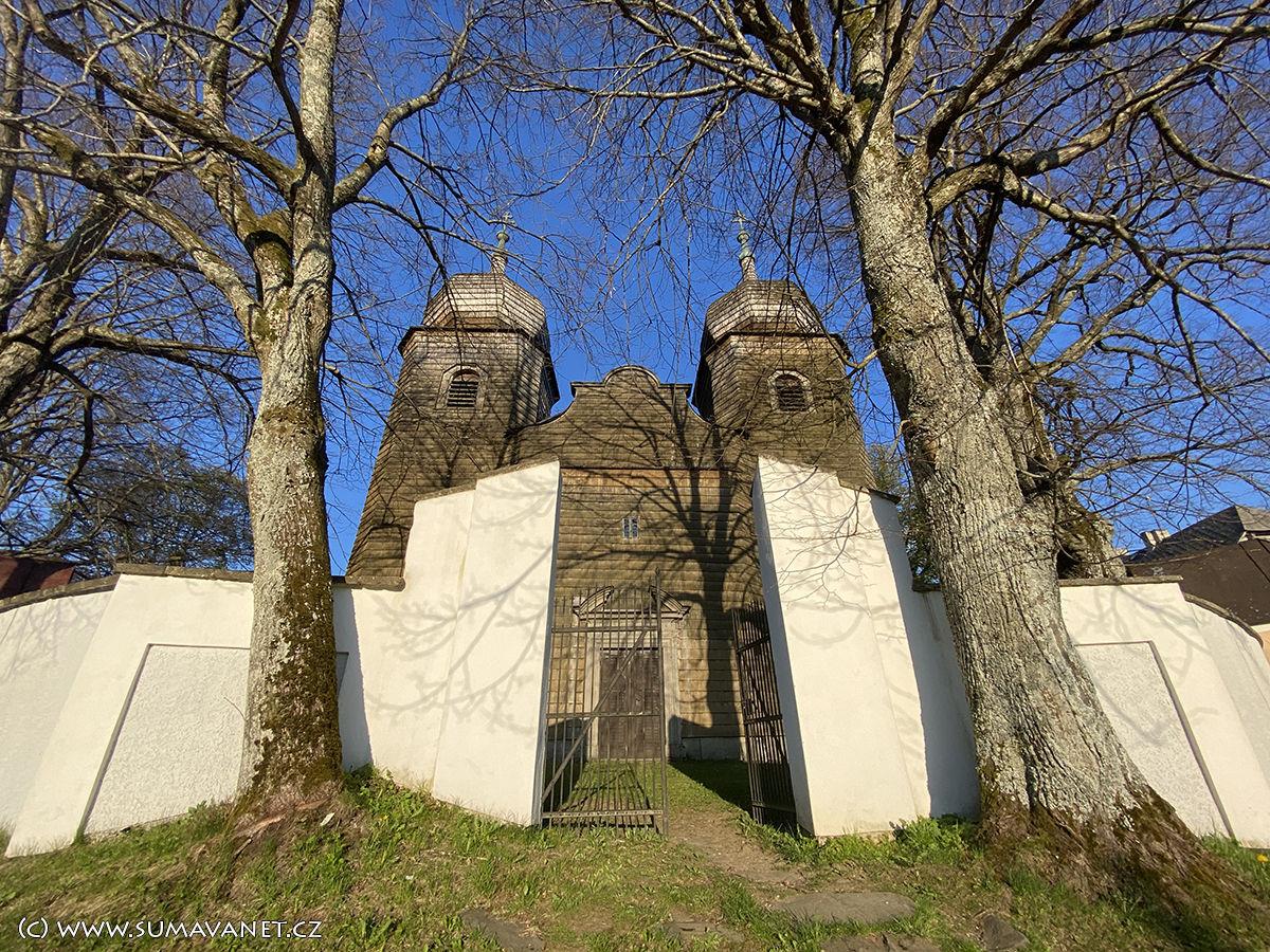 V průčelí kostela se tyčí dvě cibulovité věže pokryté šindelem.