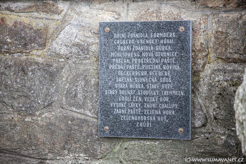 Na památku jsou uvedeny názvy zmizelých obcí a osad okolí Prášil: