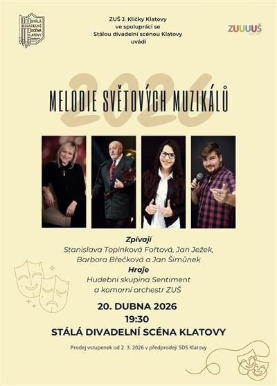 Základní umělecká škola Josefa Kličky Klatovy ve spolupráci se Stálou divadelní scénou Klatovy uvádí hudební pořad, který nabídne nejznámější melodie světových muzikálů (např. Kabaret, Bídníci, Fantom opery, Rebecca a další). Základ asi třicetičlenného doprovodného orchestru představuje hudební skupina Sentiment a kromě klatovských zpěváckých stálic (Barbora Břečková a Jan Šimůnek) se publiku představí i dva velmi vzácní hosté – Stanislava Topinková Fořtová a Jan Ježek. Jejich angažmá na profesionálních scénách (Divadlo Josefa Kajetána Tyla Plzeň, Hudební divadlo Karlín apod.) dává tušit, že na koncertu nebude nouze o nezapomenutelné hudební zážitky. | ||