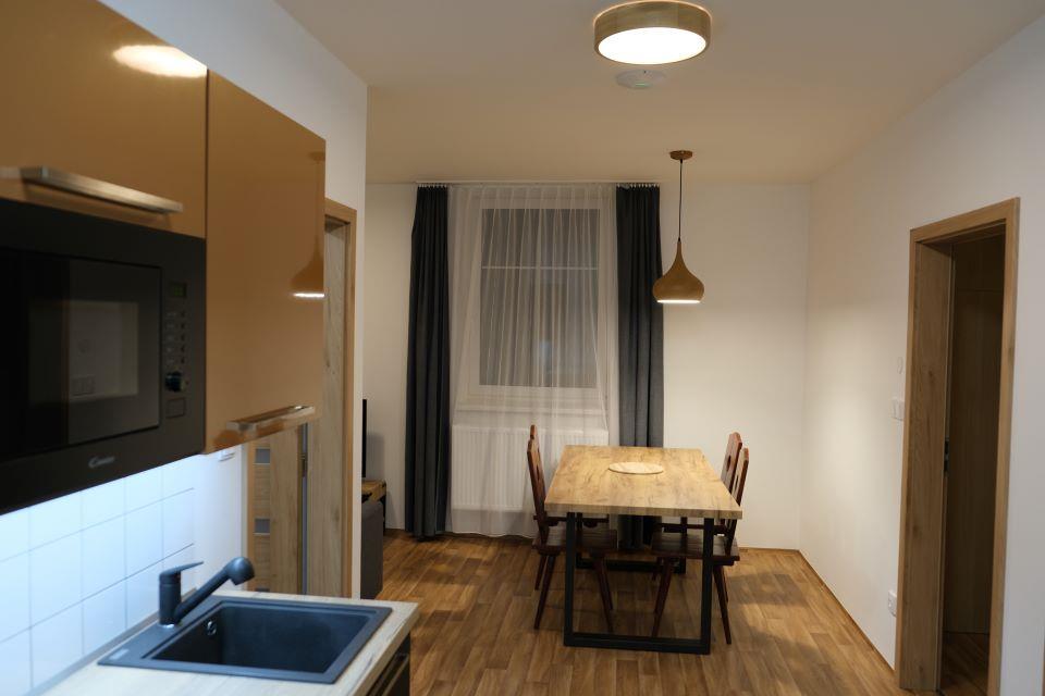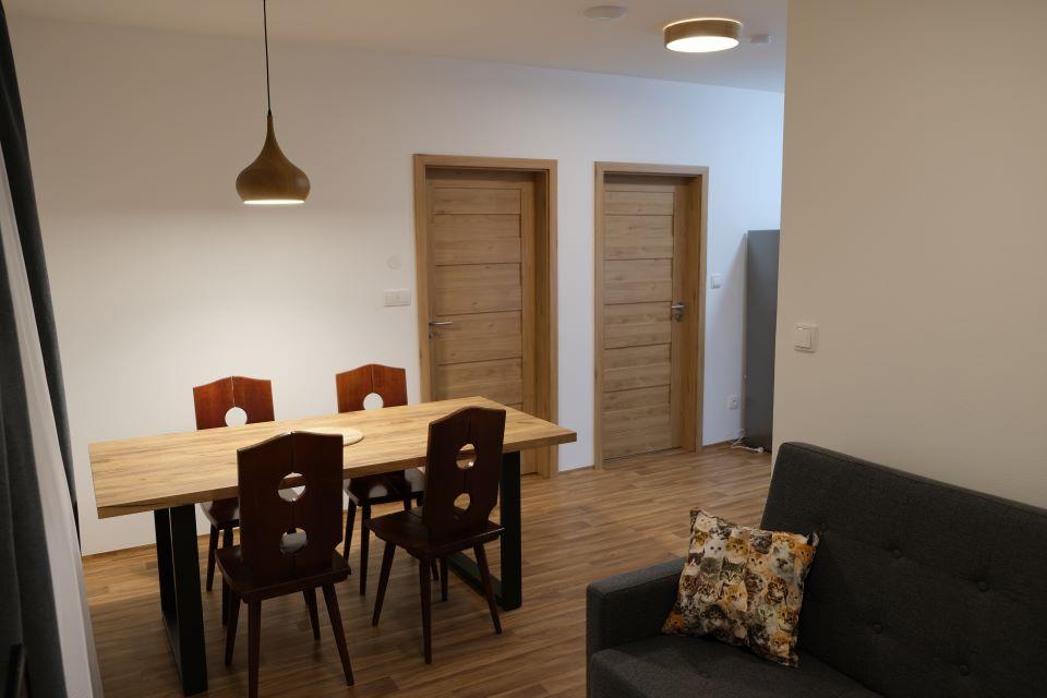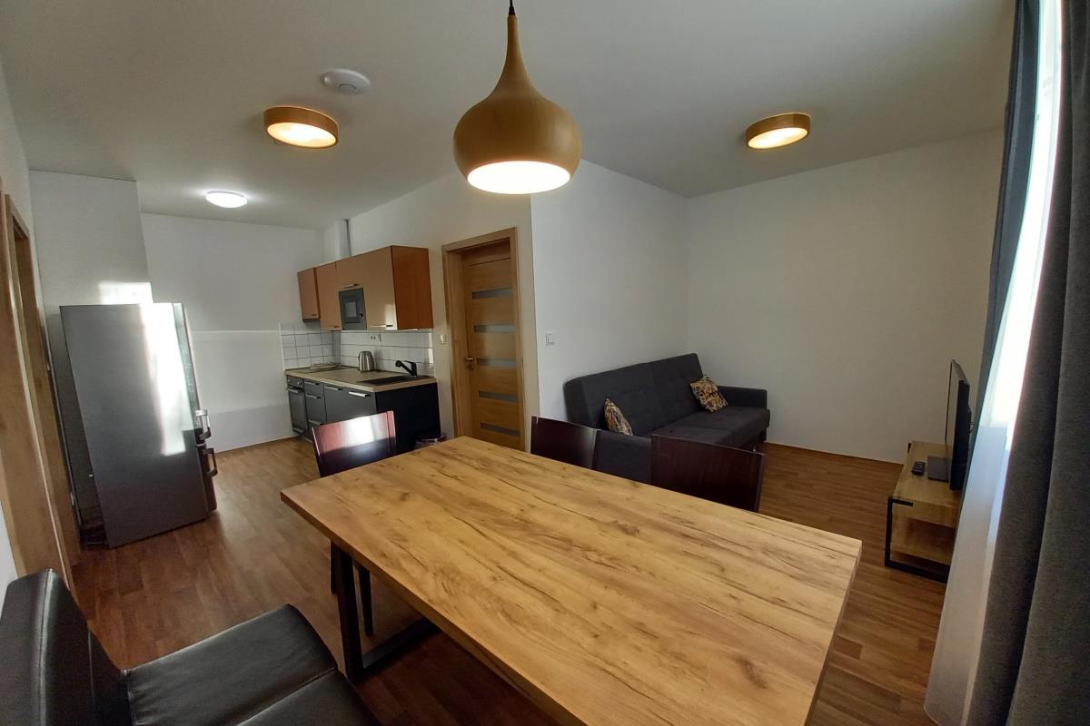 apartmány pro 4 – 6 osob s uspořádáním 3+KK, WC, sprcha, TV a Wi-Fi, komplet vybavená kuchyňka (lednice s mrazákem, myčka, trouba, mikrovlnka, nádobí, atd.)