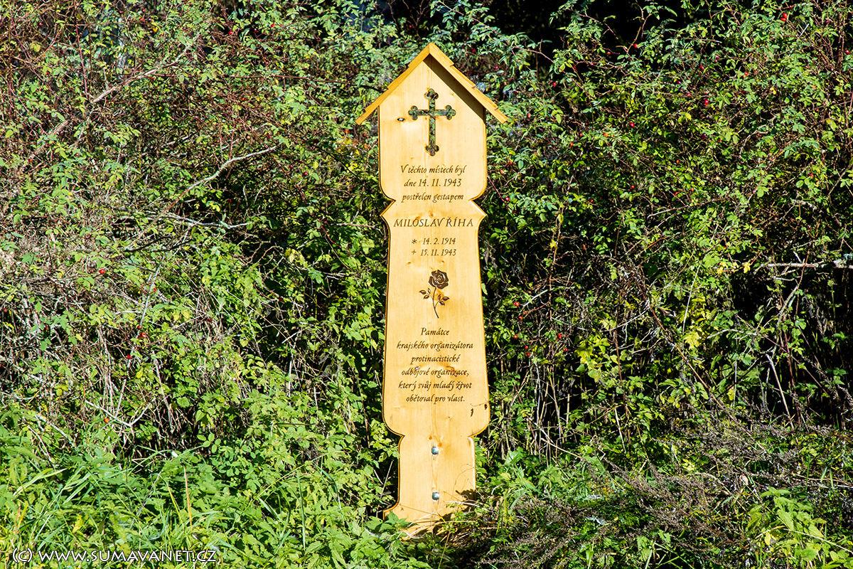 By the asphalt road (where you park) there is a memorial plaque dedicated to Míl Říh from Písek (February 14, 1914 – November 15, 1943), a member of the resistance during World War II. Říha hid from the Nazis in the Žežulka yard of owner Franz Seidl. Here he was severely wounded by the Gestapo, and succumbed to his injuries in the General Public District Hospital in Sušice. The board stands on the site of Seidl's former house