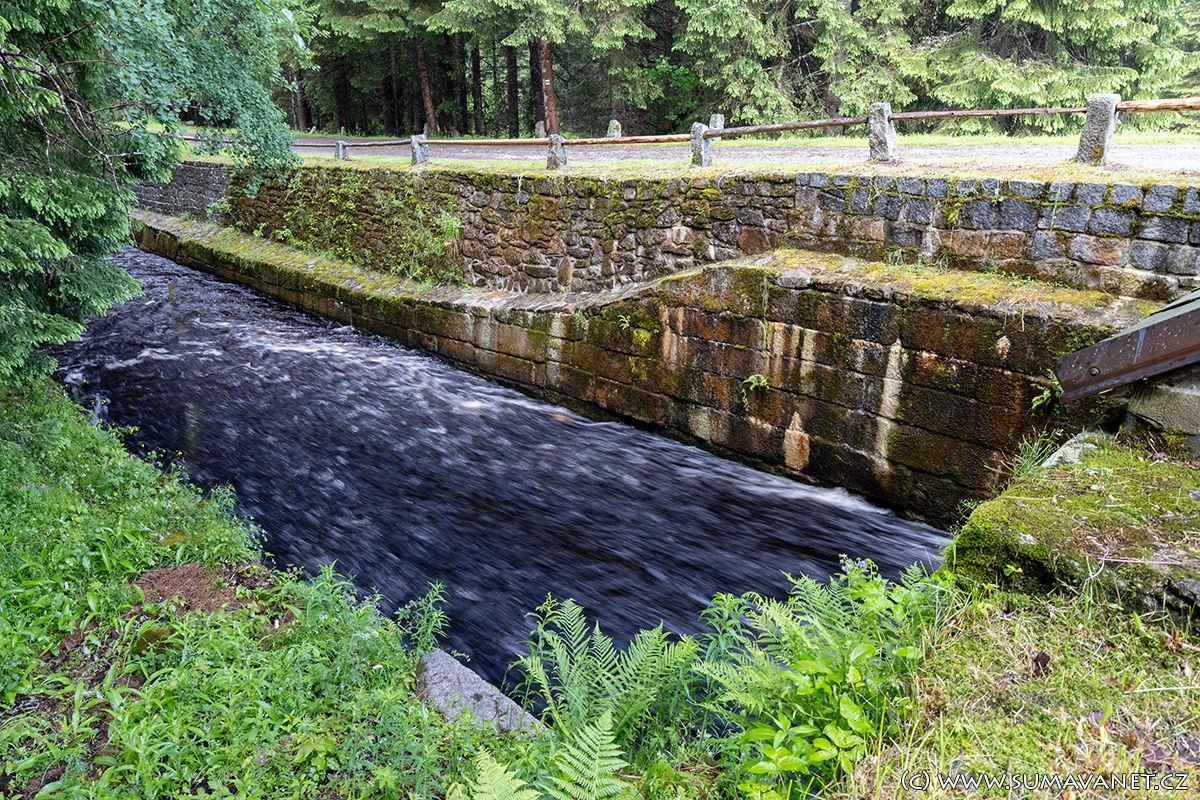 První 2 km vede kanál podél Vydry až nad bývalý královácký dvorec Antýgl, kde se prudce stáčí zpět a vede podél Rokyty a kolem Kostelního vrchu k osadě Mosau. Zde překračuje silnici Srní - Prášily a pokračuje pod Spálený vrch.
