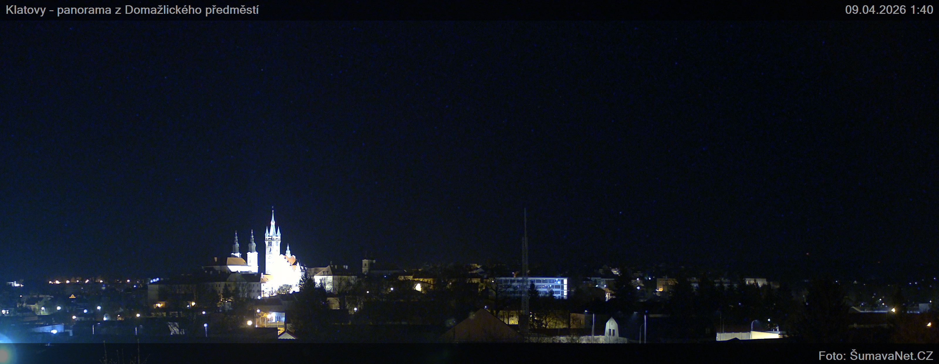 Klatovy - panorama z Domažlického předměstíVelký obrázek09.04.2026 0:00:43Vyberte čas: Archiv: Dnes 1 den 2 dny týden měsíc 100 dnů rok Detail Znovunačtení stránky - Refresh pageObrázek je z kamery snímán každých 10 minut Obrázek Vám přináší ŠumavaNet.CZ Umístění kamery: