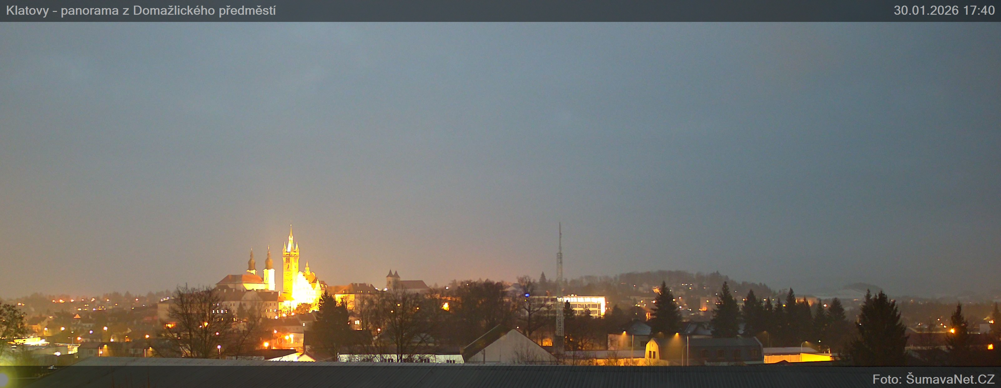 Klatovy - panorama z Domažlického předměstíVelký obrázek30.01.2026 15:00:47Vyberte čas: Archiv: Dnes 1 den 2 dny týden měsíc 100 dnů rok Detail Znovunačtení stránky - Refresh pageObrázek je z kamery snímán každých 10 minut Obrázek Vám přináší ŠumavaNet.CZ Umístění kamery: