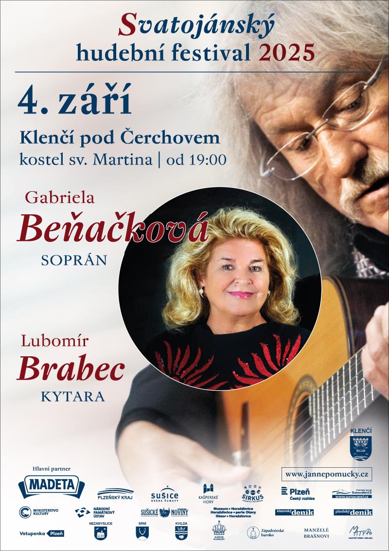 Ve čtvrtek 4. září v 19.00 hodin vystoupí v Klenčí pod Čerchovem maestra Gabriela Beňačková. Časopis Opera ji zařadil mezi deset největších pěveckých osobností posledních padesáti let. Nyní končí svoji pěveckou kariéru a při té příležitosti se rozhodla uspořádat jeden ze svých posledních koncertů na Svatojánském hudebním festivalu. Vystoupí na něm spolu s kytaristou Lubomírem Brabcem, s kterým již dvacet let spolupracuje