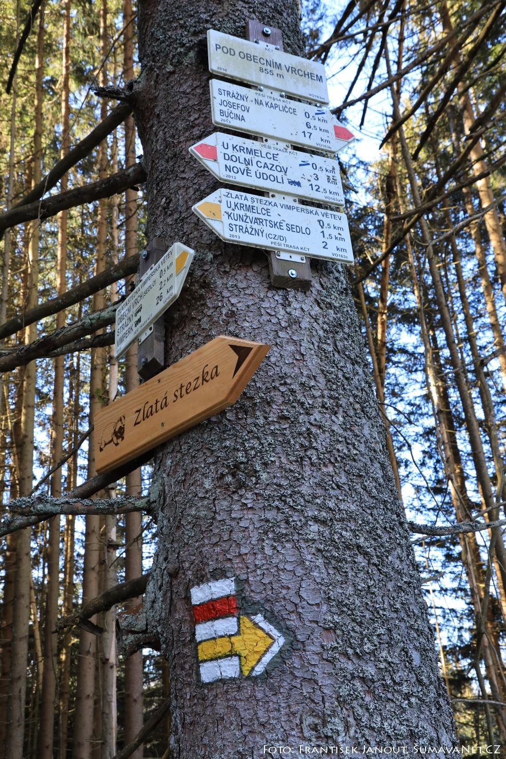 Doporučujeme výlet v okolí Strážného s výstupem na Obecní vrch (937 m). Holiny, které pod vrcholem vznikly vykácením lesa po napadení kůrovcem, umožňují prakticky kruhový rozhled na českou i bavorskou stranu hranice. Trasa vede po turisticky značených trasách, po nichž zčásti vedla vimperská větev bývalé Zlaté stezky (na stezce jsou instalovány informační panely).