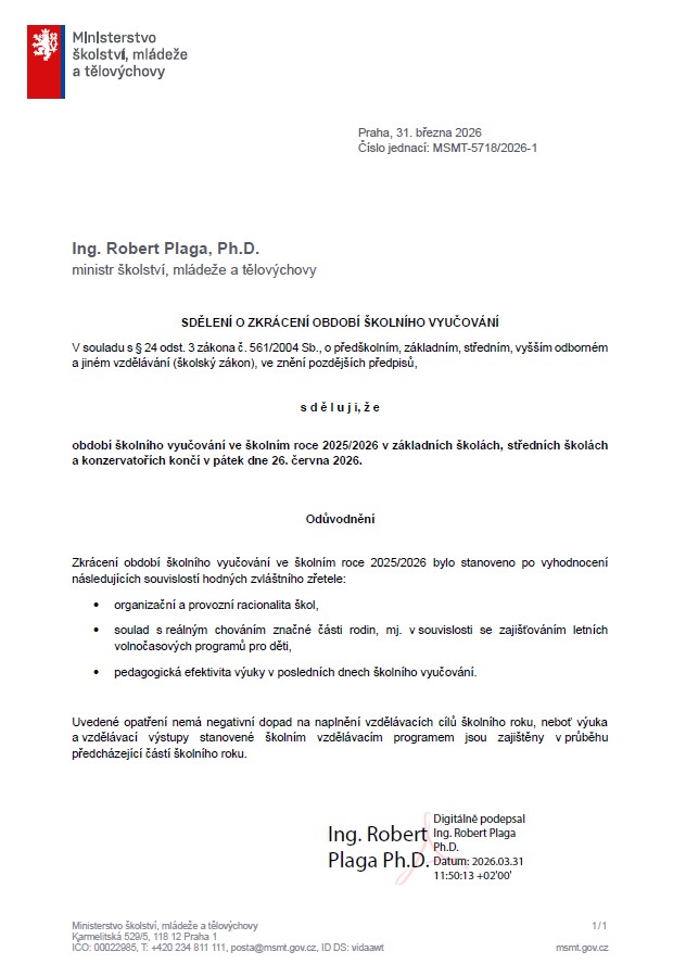 SDĚLENÍ O ZKRÁCENÍ OBDOBÍ ŠKOLNÍHO VYUČOVÁNÍ | ZŠ Plánická Klatovy
